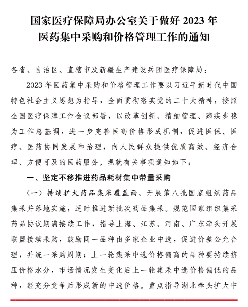 國家醫療保障局辦公室關于做好2023年醫藥集中采購和價格管理工作的通知
